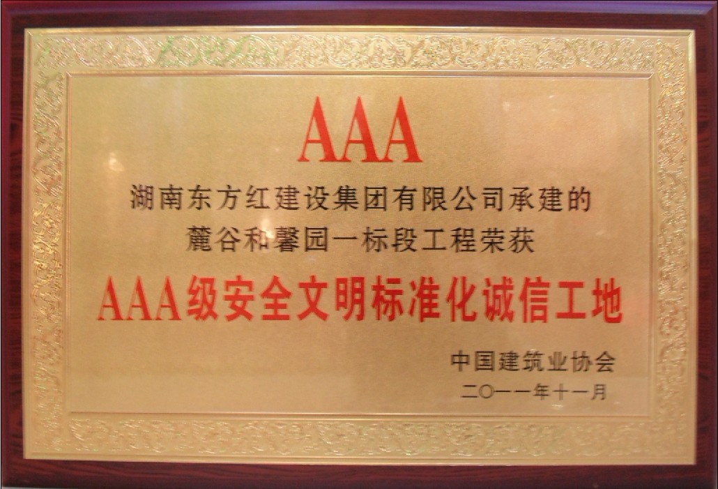 麓谷和馨園A區(qū)一標(biāo)段工程榮獲“全國(guó)AAA級(jí)安全文明標(biāo)準(zhǔn)化誠(chéng)信工地”稱號(hào)